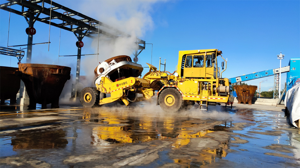 由中冶寶鋼研制的70噸鉸接式抱罐車,采用鵝頸鉸接型式,額定載重75噸,重載最高時速為每小時20公里,翻罐角度105度,最大爬坡能力8%,最小轉彎半徑9米。該車型應用專利技術10項,在國內有色冶煉市場占有率超過75%,先后榮獲中國有色工業(yè)協(xié)會、中國鋼鐵工業(yè)協(xié)會科技獎,中國施工企業(yè)管理和中國循環(huán)經濟協(xié)會專利獎等榮譽。